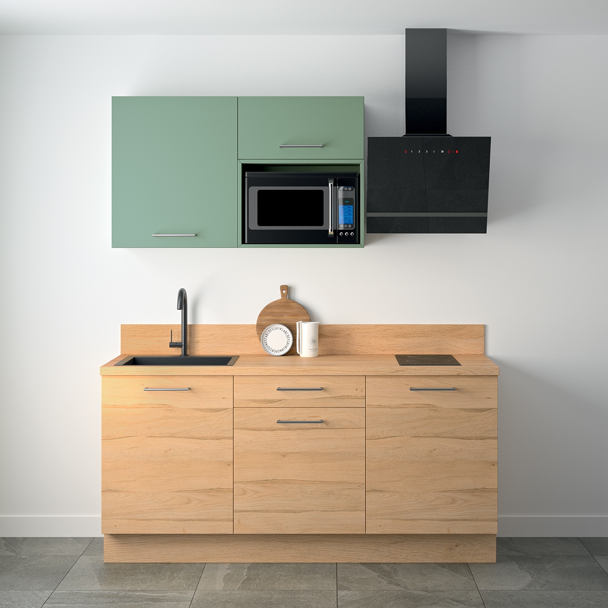 Le prix de cette cuisine ne comprend pas : la hotte, le micro-ondes, l'évier et le mitigeur. Vous pouvez ajouter ces produits à cette cuisine préconfigurée en parcourant nos différentes catégories d'équipement : Electroménager / Eviers et mitigeurs.