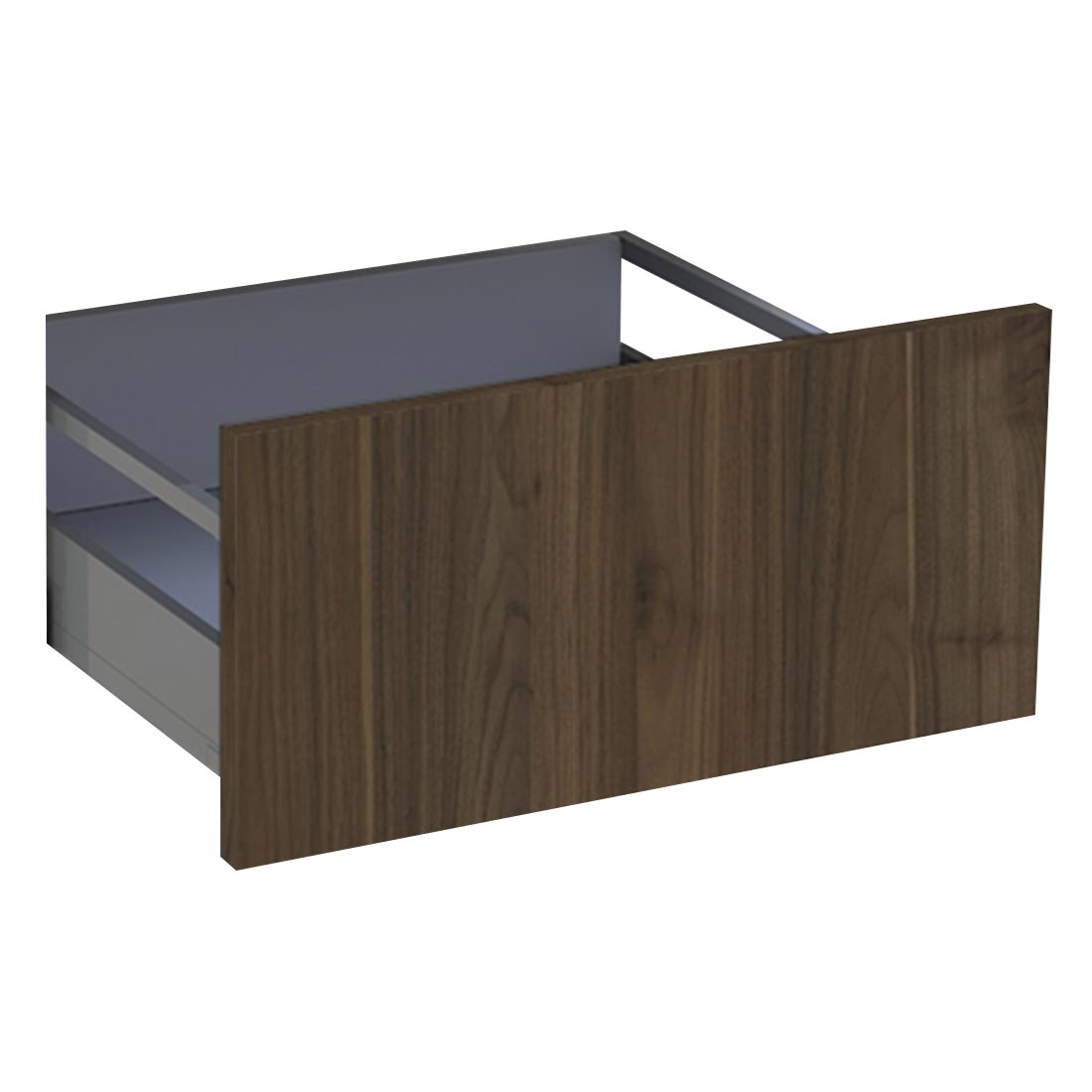 Kit façade 1 casserolier 60 cm hauteur 28,5 cm Noyer Foncé en panneau de particules surfacé mélaminé structuré décor imitation essence de bois chêne ép. 1,8 cm - Finition Bois structuré - Chants ABS assortis - Intérieur assorti - Tiroir double paroi droite métallique anthracite - Quincaillerie d'assemblage fournie. (L. 59,7 - H. 28,5 - E. 1,8 cm) - A monter soi-même.